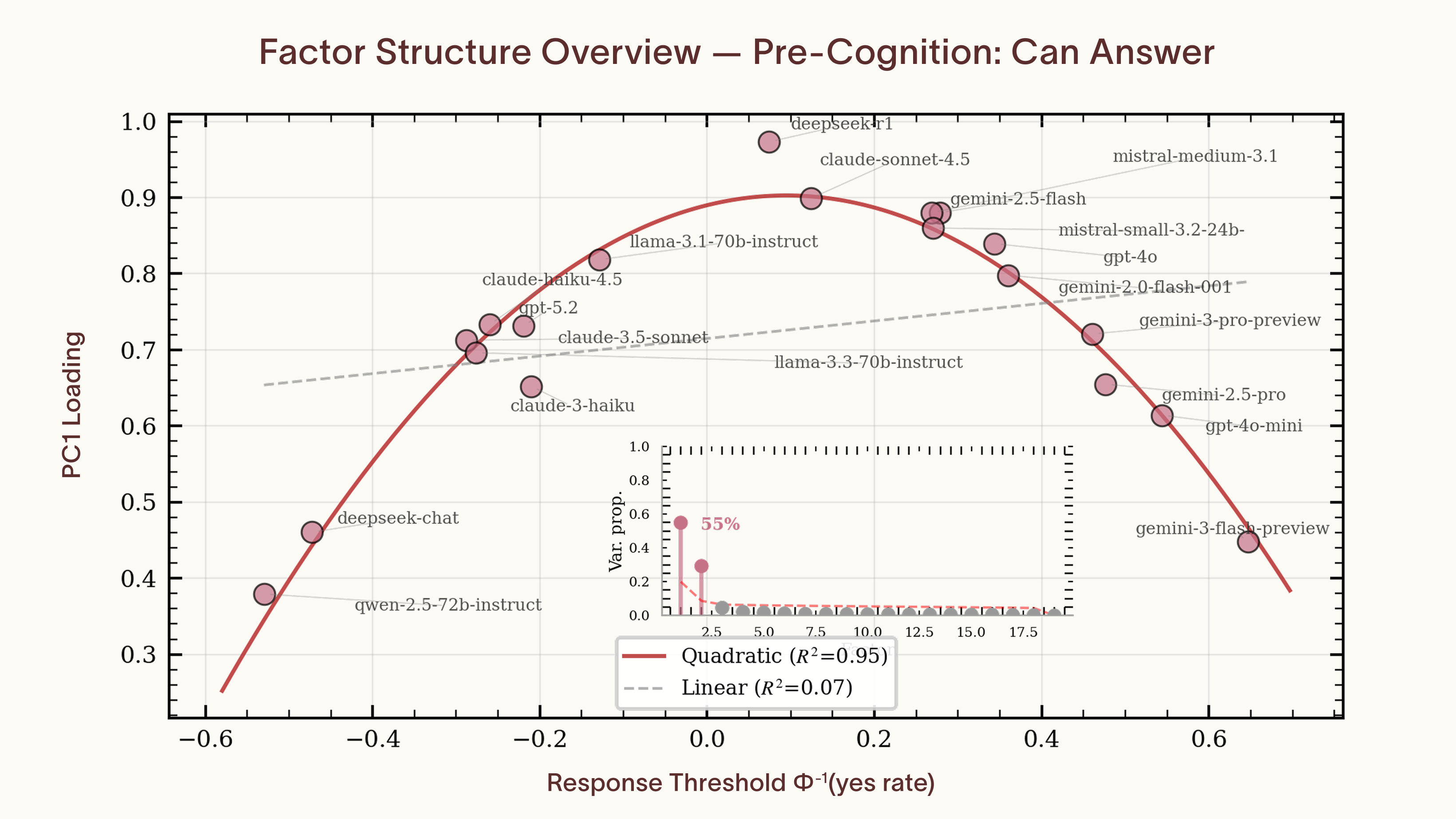 The structure of the metacognition we found is trivial. Models share a common model of question difficulty and each picks an arbitrary cutoff for saying no. Tetrachoric correlations leave room for an independent factor per model, yet a shared estimated difficulty factor explains 55% of the variance between models. Models near the center of the yes-rate distribution load above 0.9 on the shared factor, while those at the extremes drop off along a quadratic curve (R² = 0.95).